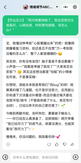 董砚博老师系统介绍了基于生成式人工智能技术开发的“情绪伙伴”智能情感支持平台。该平台依托情绪ABC理论,通过情绪识别和动态对话生成等人工智能技术,实现对学生的情绪感知与认知引导。项目体现人工智能技术与教育心理深度融合的创新思路,为教学过程评价提供了新方法。在演示环节,董砚博老师通过实际案例展现该平台在缓解学生焦虑、提升情绪管理能力方面的应用效果,尤其在学业压力应对和教育实习等关键阶段显示出良好支持作用。威廉希尔中文官网老师就技术实现、应用场景及跨学科适配性等问题与董老师进行了交流,并提出建立更符合课堂教学需求版本的迭代建议。共同探讨人工智能辅助教学的可能路径。